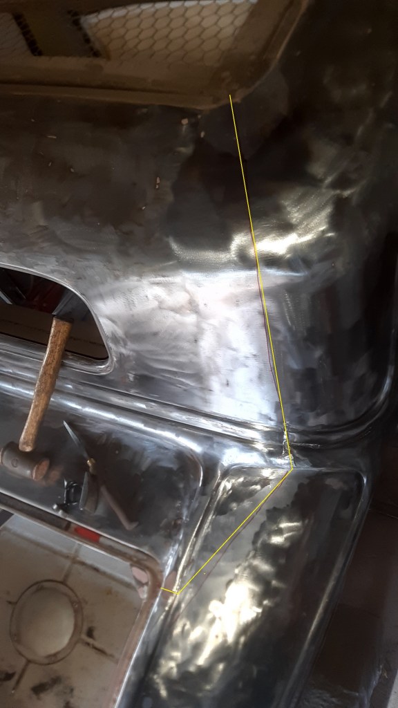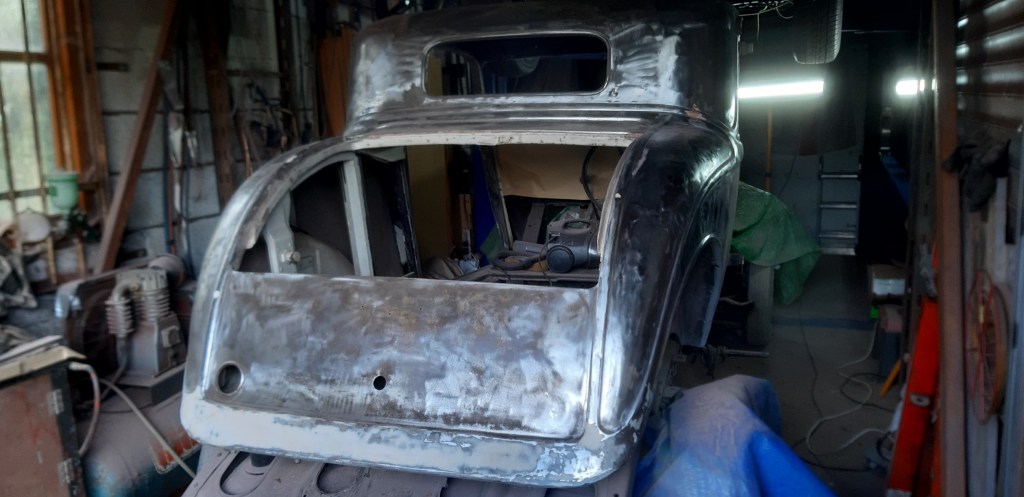 04/10/2021 The workshop have been moved around, the PD which has been on my 2 post lift since February 2018 is now on the floor, My 41 truck is on the lift now. First thing to do on the body is to remove all the paint back to bare metal, this is because the paint has cracked at the sharp corners of the bead lines and there are plenty of them.
