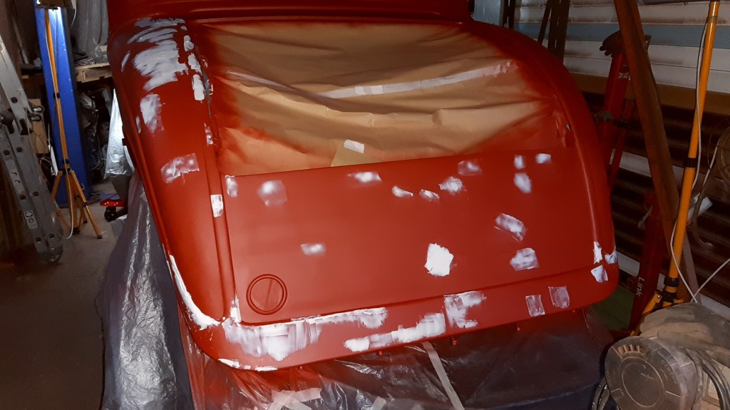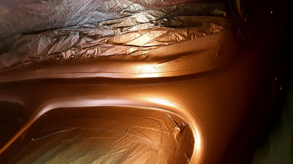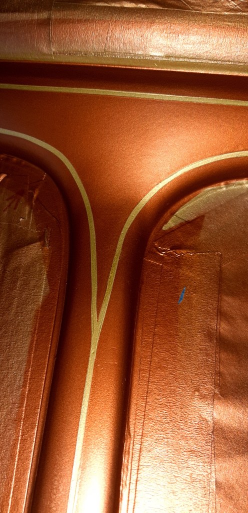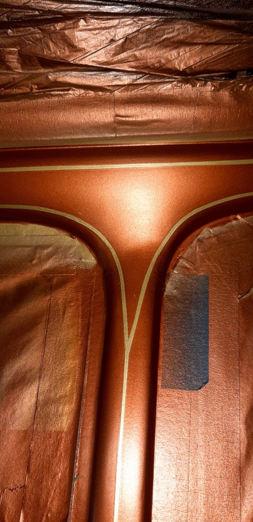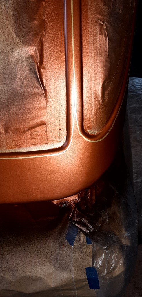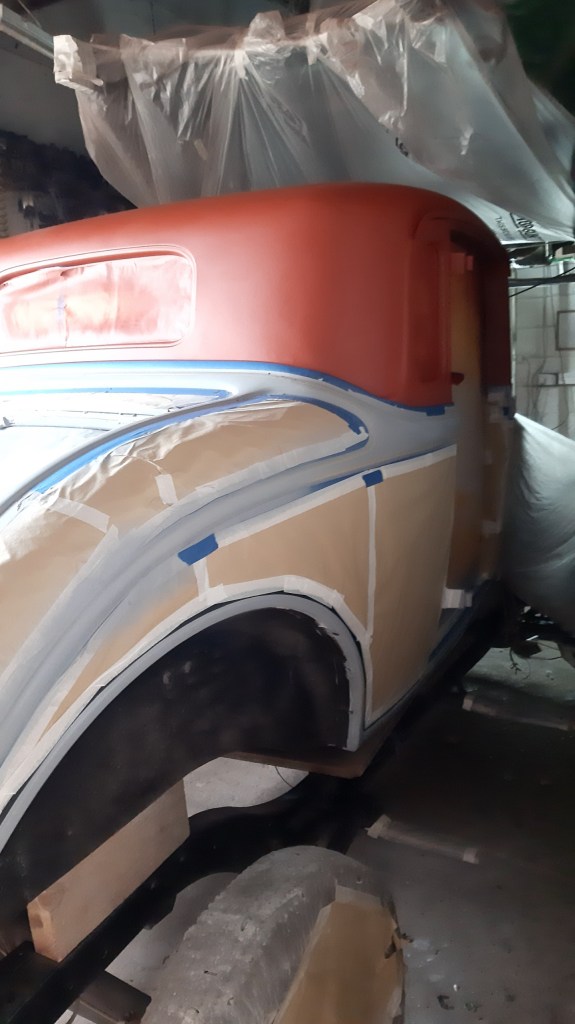 04/03/2022 This respray is taking forever only hope when finished the onlookers appreciate the time and money spent on it to give the desired effect. this is the problem on knowing what I want it to be without having the skill set to achieve it. The bead lines will be Metallic Brown with Gold Pin Stripes on an Old English White back ground. Because of the length of time involved and the fact of having to use Base coat and 2K Clear coat the car has been masked up again.