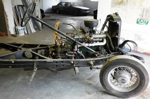 Hi gents, I am about to view the above that is basically a rolling chassis with a running engine and gearbox, the prop has been removed to ease movement. My understanding is that it comes with a full set of parts with the exception of:- missing sidemount covers, door cards, wood is there on the headlining but no fabric or vinyl, glass is missing and it requires a 10″ steel plate welding under the rumble seat. Apart from a few dents or dings the body is sound as are the fenders and hood.