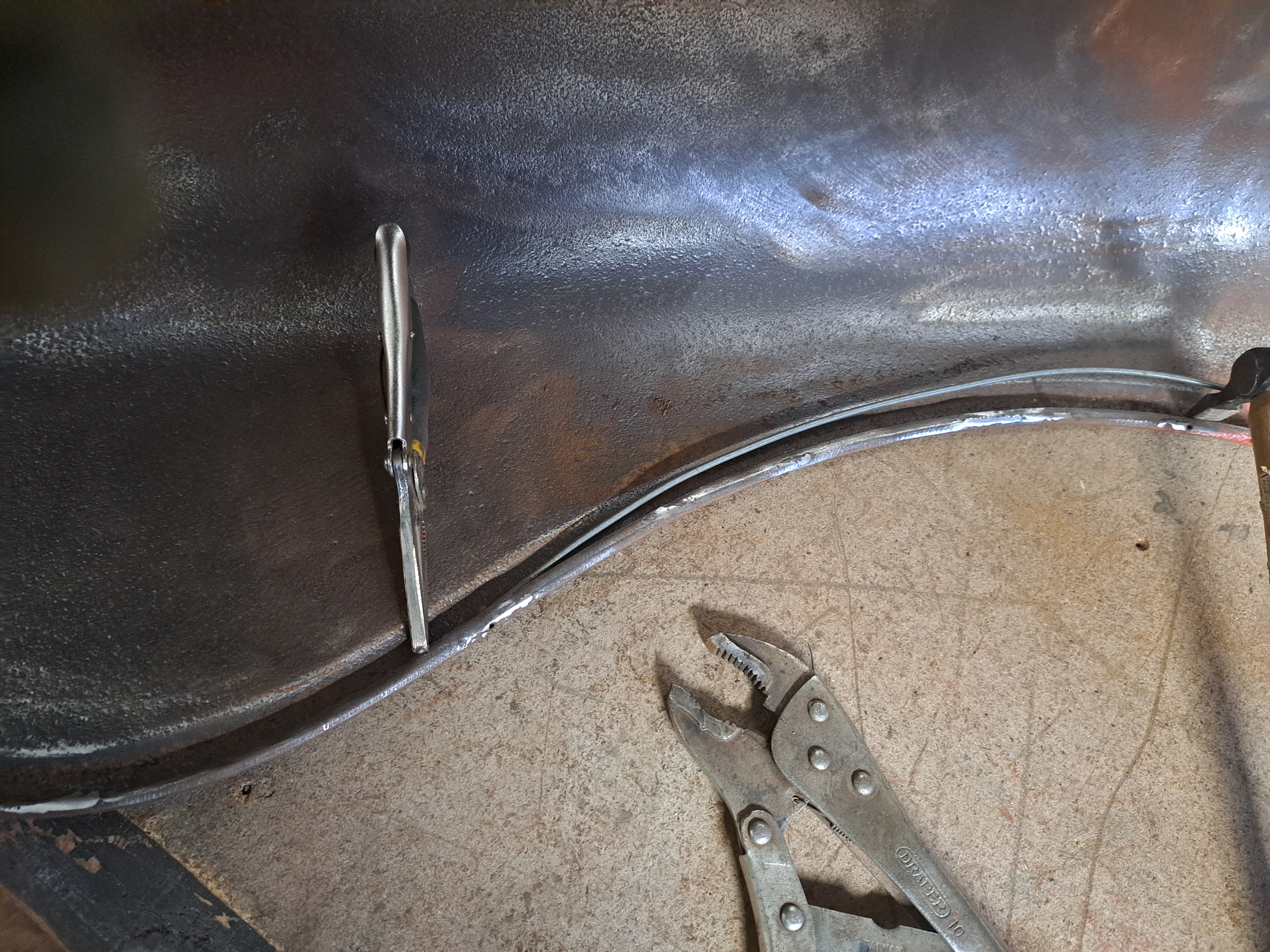11/12/2023 Replacement of the wire in the rolled edge, never done a full length replacement, this was due to the state of disrepair when I took this truck on. There was two section of this fender replaced a 12″ length just forward of the centre of the wheel arch and a complete forward section ar the front. Wire edge add strength to the outer edge, basically sheet metal is wrapped around a 0.1 dia steel wire.