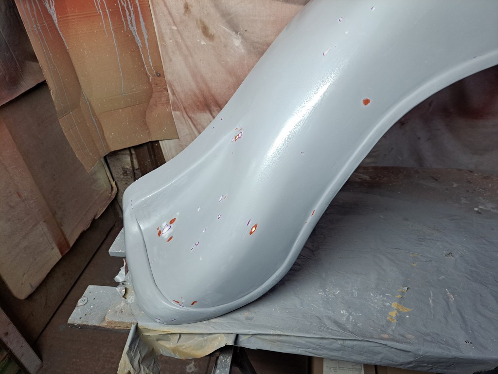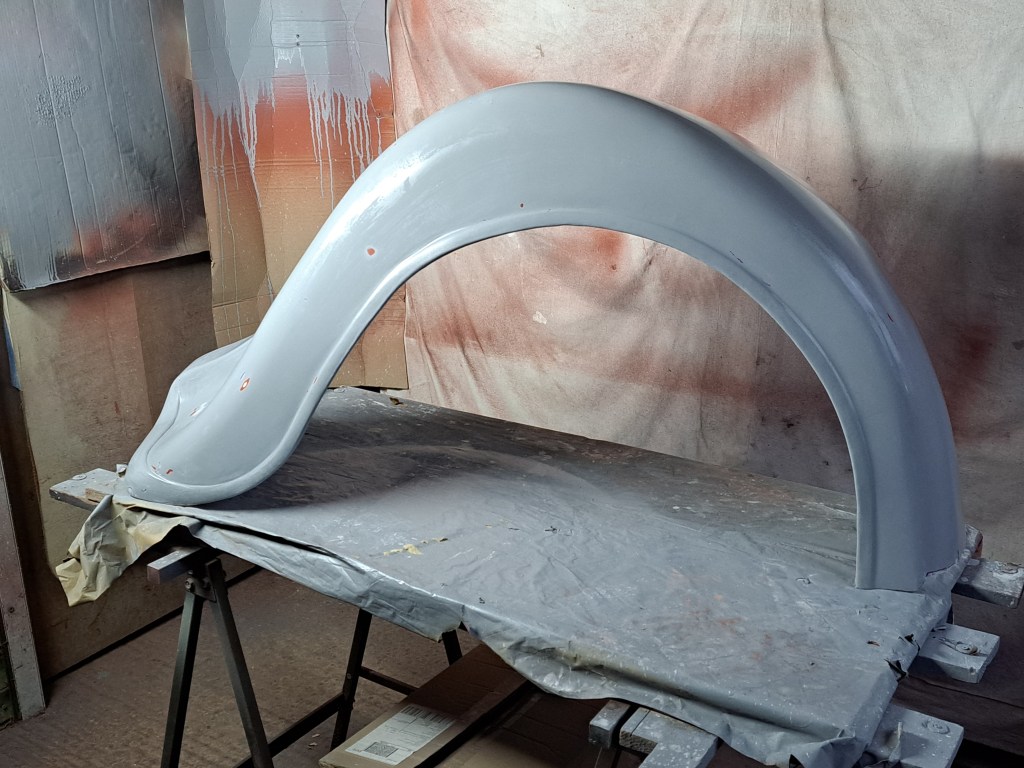 14/03/2024 Front fenders are now ready for top coat, so I have now completed most of the prep work on the hand crafted rear fenders, once this prep work is finished all four fender will be top coated before going into store for safe keeping.
