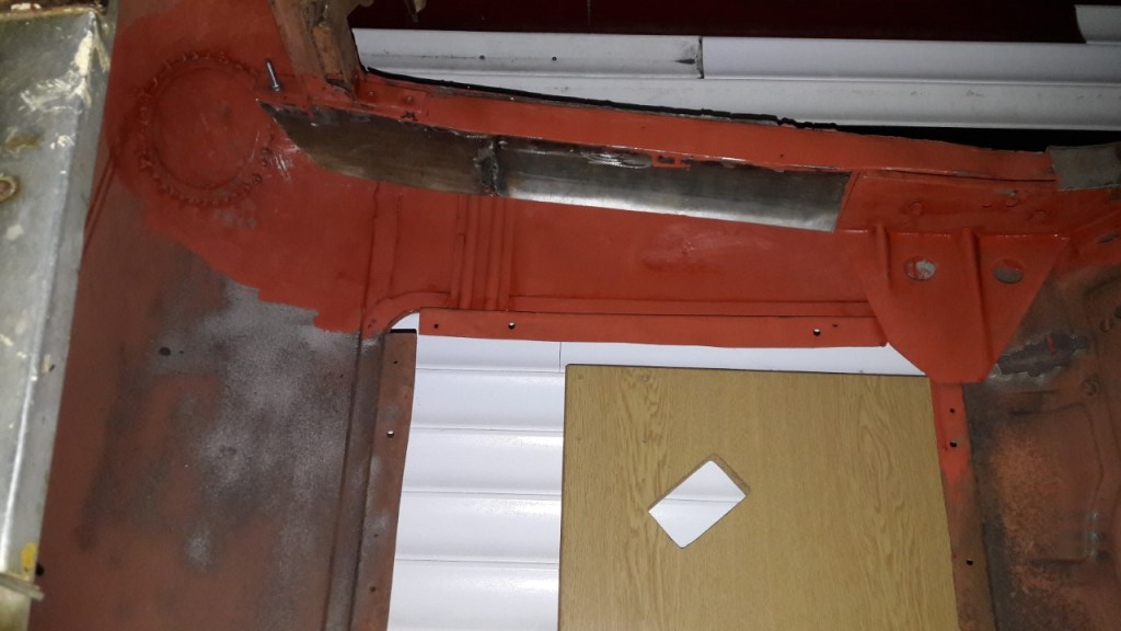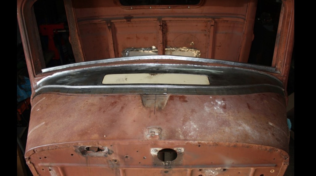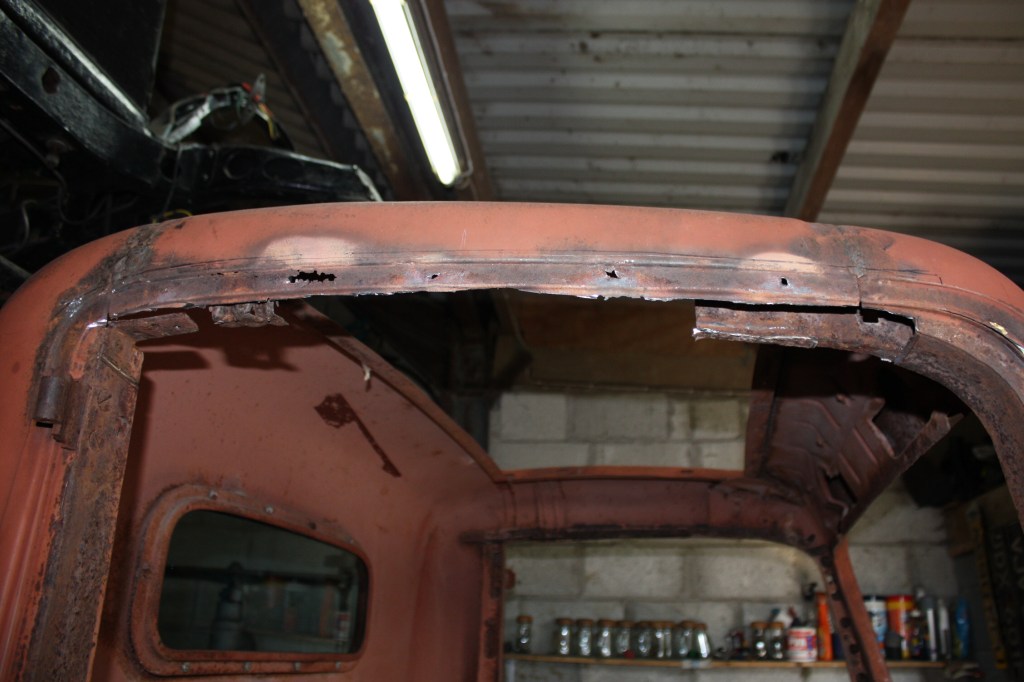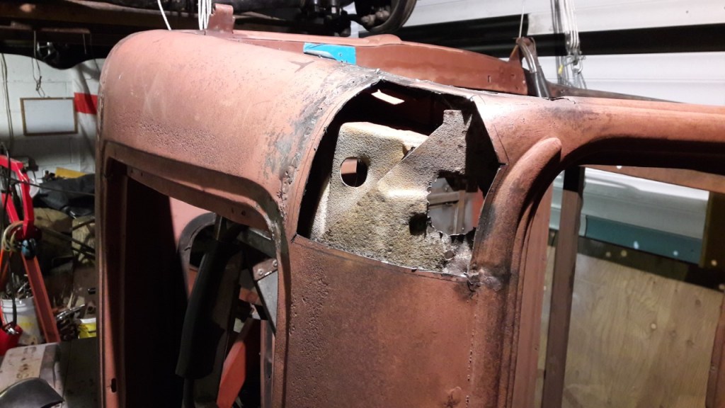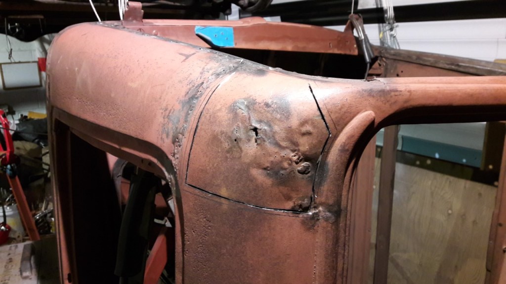 Extensive new metal was needed in the Cab, most of the lower belt line was either toast or badly knocked about. Had a local sheet metal company to CNC bend the profile in 48” lengths which turned out perfect. Some details were more challenging than others this bottom corner was a pig. The left corner was saved. Was hoping not to have to insert the large repair patch but the metal was too thin. The A & B pillars were sound so next was the heads of the door openings, in places these were nonexistence.