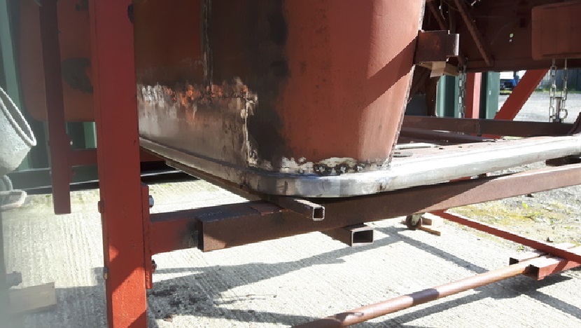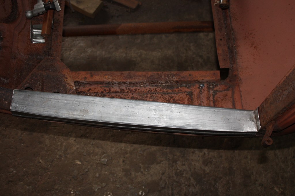 Without the turnover jig this would have been a no no, the cradle of the jig is a rectangular frame welded solid to prevent any distortion occurring during the many hrs of work. Casters are bolted to the bottom of the jig so that its mobile, the axis of the frame needs to be central about the body weight, I used a piece of 3” ø tube revolving in a 3 ½” sq tube with a series of holes so that I could tip the body in 22 1/2° increments.