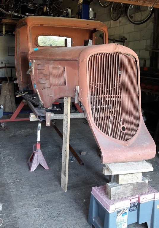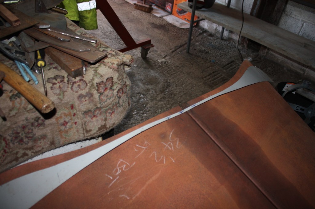 This made thing somewhat difficult due to the front A frame of the turn over jig being in the way, if I had more space putting the cab on the chassis would have been the best option but I’m used to working in a shoe box. The decision was made to put axle stands under the front of the cab and remove the A frame making sure nothing was knocked or moved. The Hood Doors marry to the sides of the Cowl perfectly so am half way there, (strange thing is this question keeps coming back, what other models in the Chrysler range made this change). First to make a template of the new panel, always work on the large size as it’s easier to cut off than it is to weld on. This is about as far as I can go without a big move around in my small workshop.