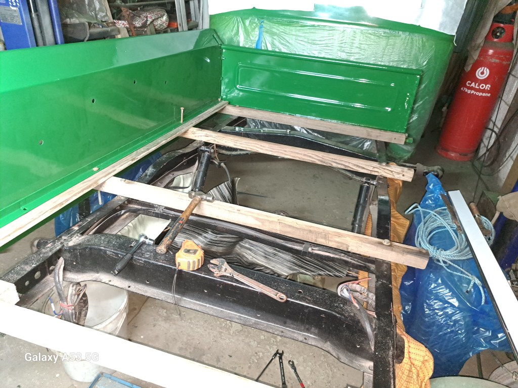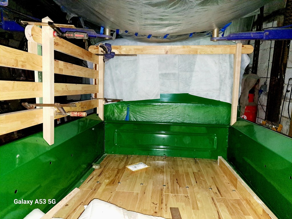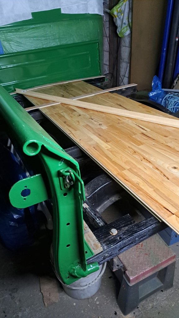 07/02/2025 Bed floor is fitted, just a stainless angle to protect the boards when the Tailgate is down. Posts are made to fit the Steak- pockets, Bolster is fitted and the Side rails are being worked on now.