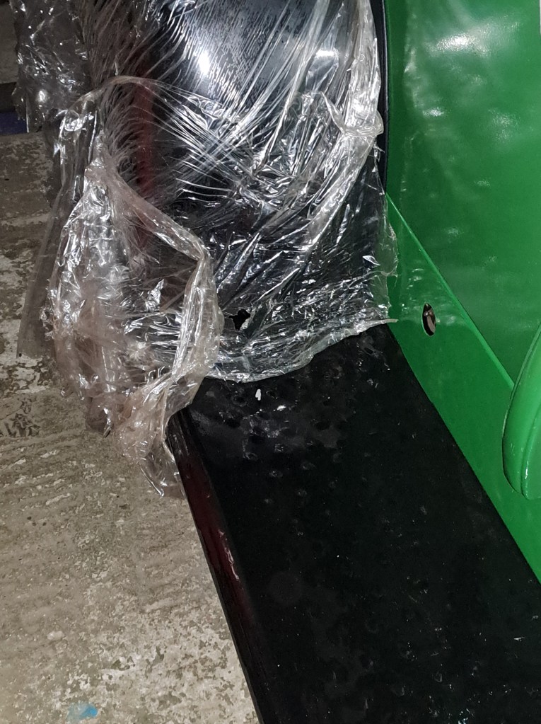 When the fenders were put into storage they were wrapped in shrink wrap not only to protect them but also to retain their paint shop luster.