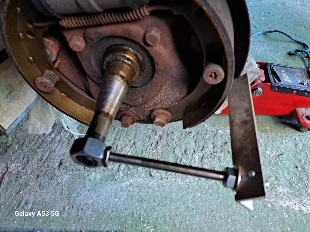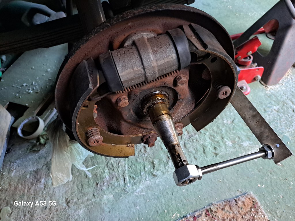 09/04/2025 Have started the brake overall, not something I have done for yrs. To start with I made a shoe truing tool, that reqired a 3/4 x 16 UNF Nut to screw onto the drive shaft, after drilling an 8.5mm hole into one side of the nut and then tapped M10 thread into it a 7″ length of studding to give me the arm to mount a finger gauge to.