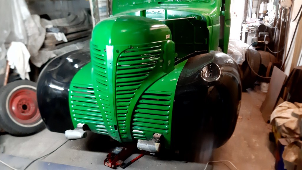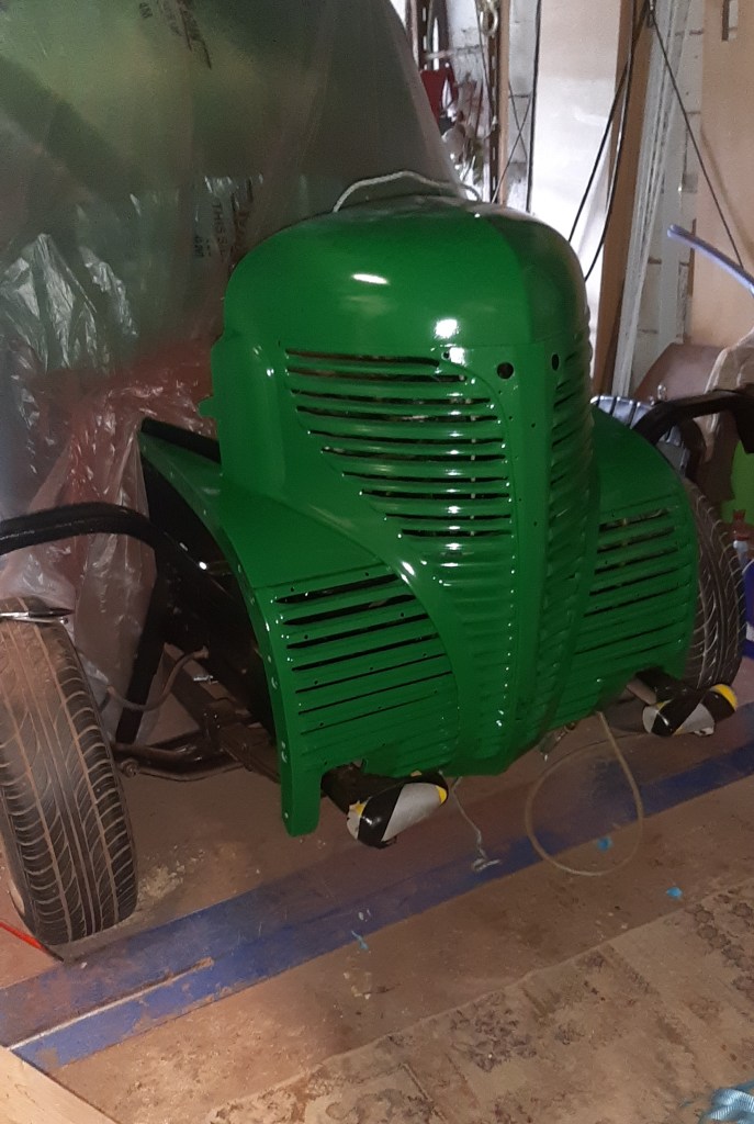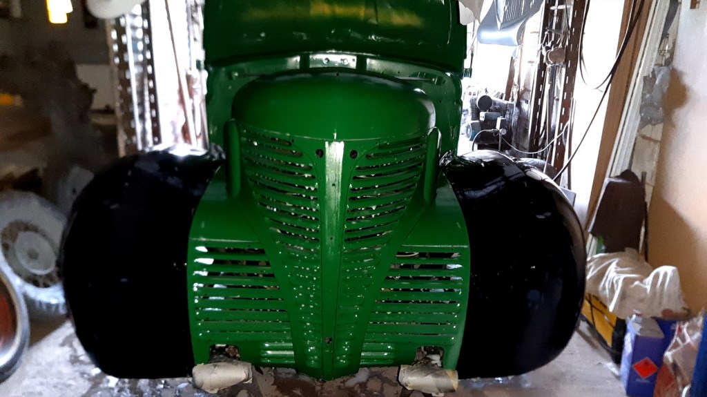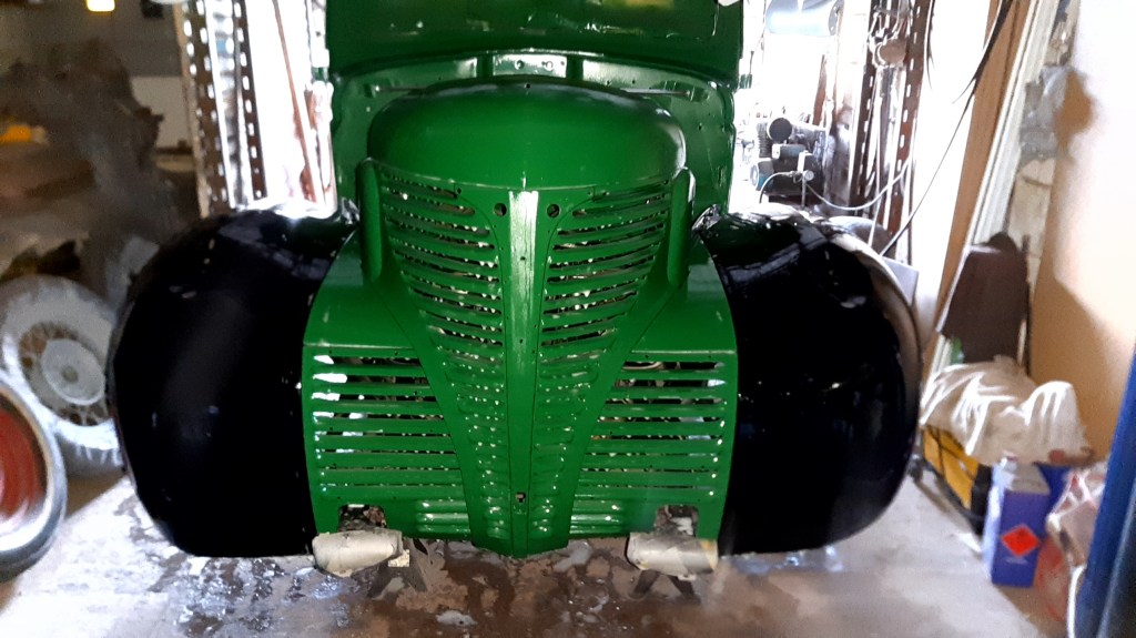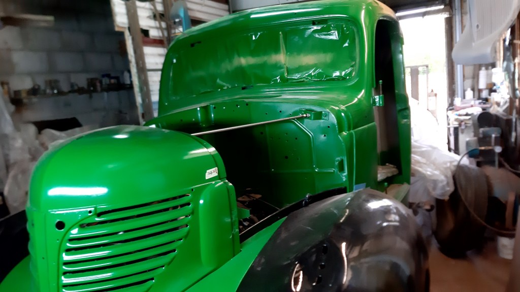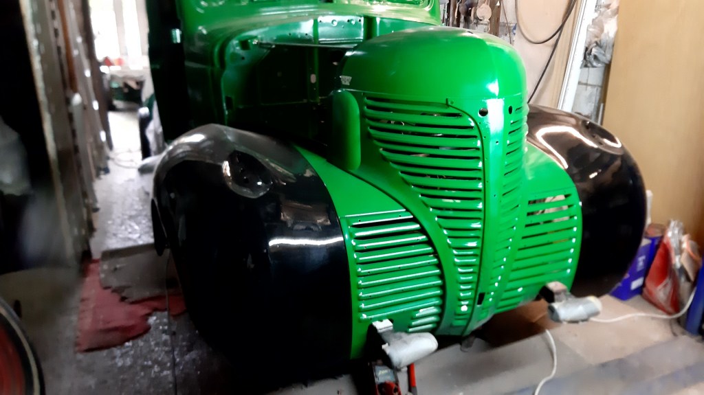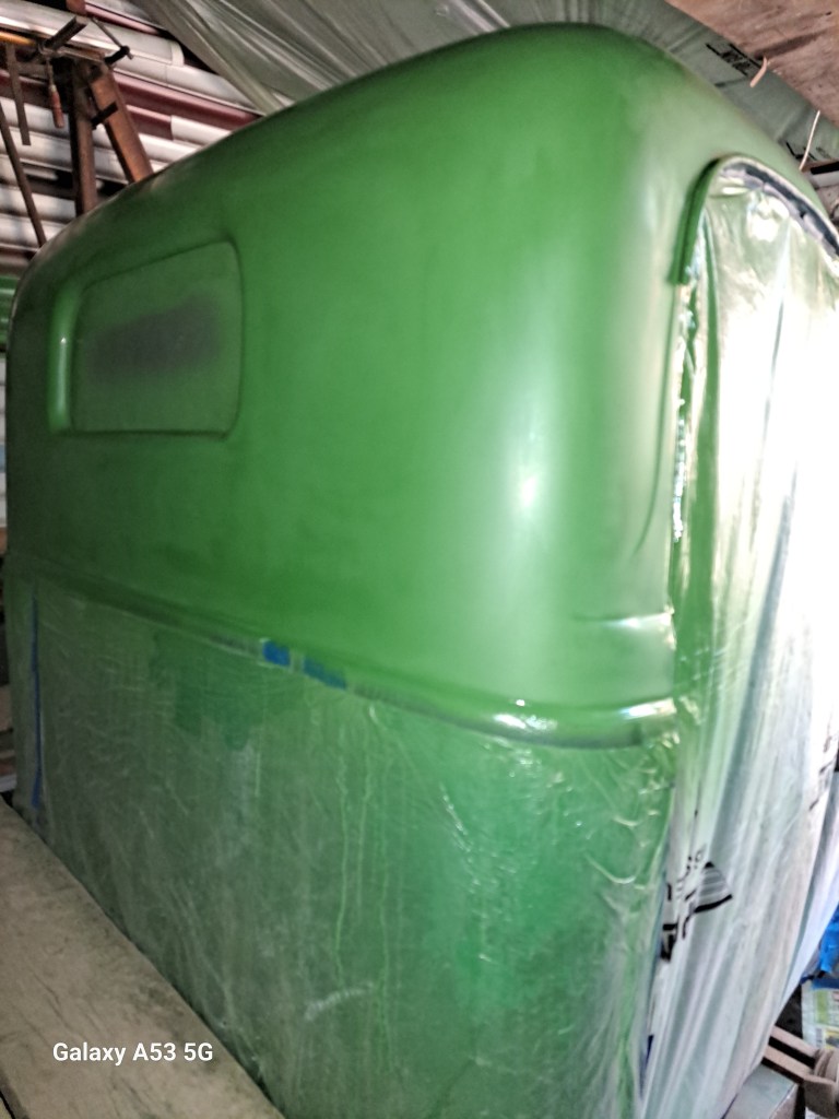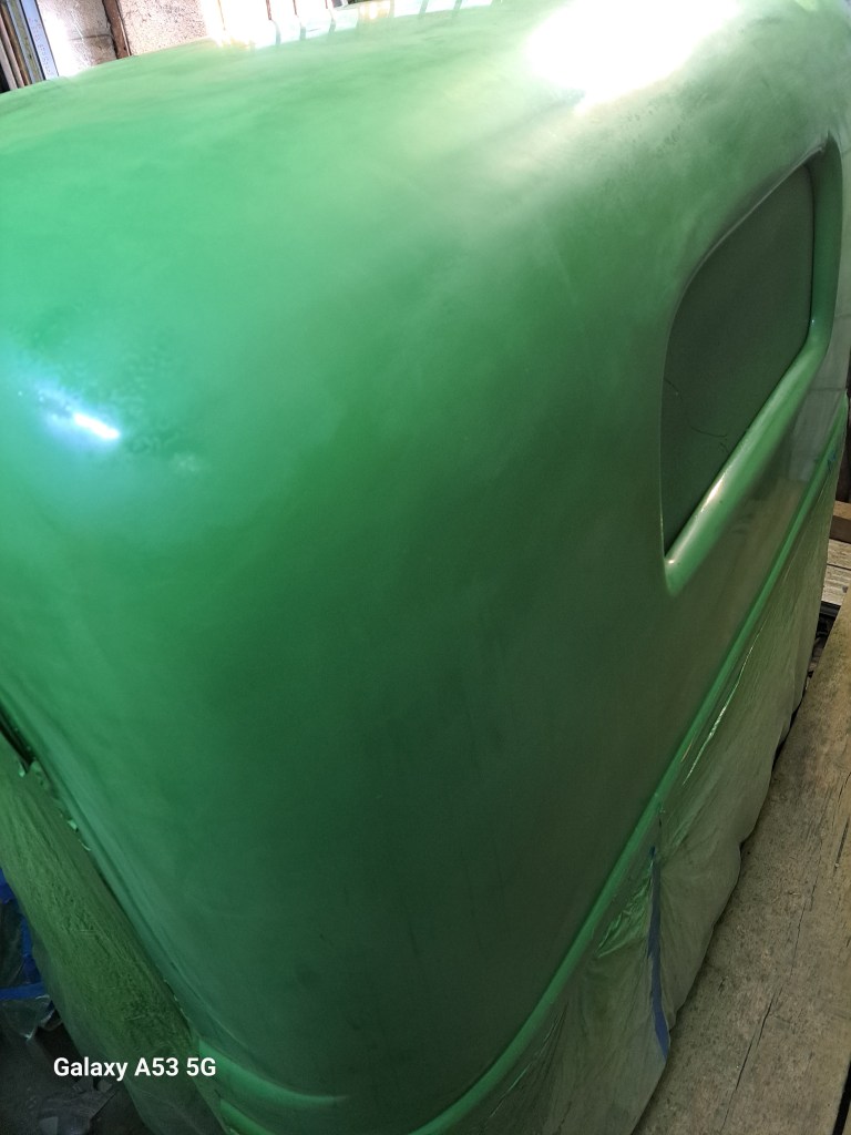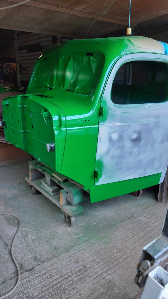 The Cab is now ready to go back on the frame, requires more paint but nothing that can’t be done later. The green has now had 3 coats rubbing down with P400 & P1000 wet and dry. Some areas will get P2000 before using a polishing mop with Canuba cutting compound.