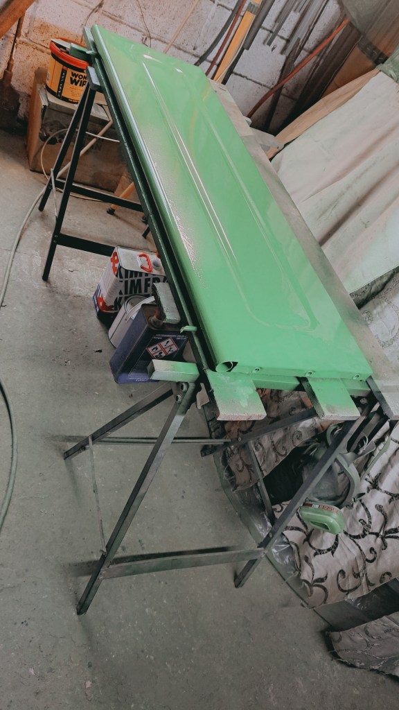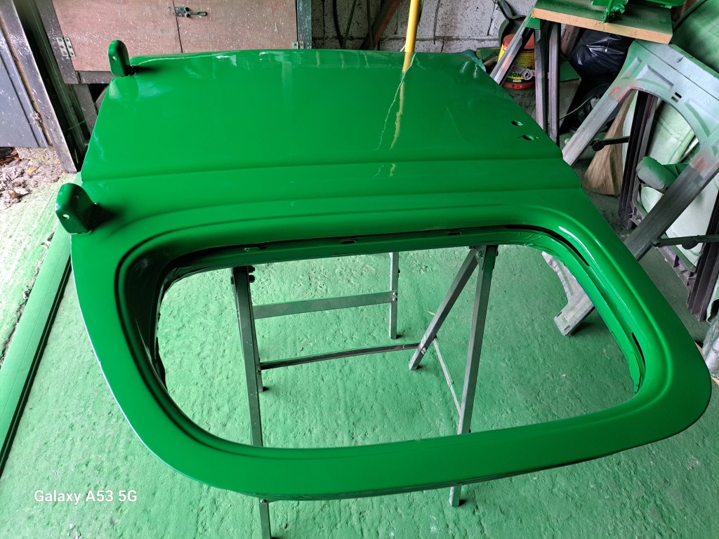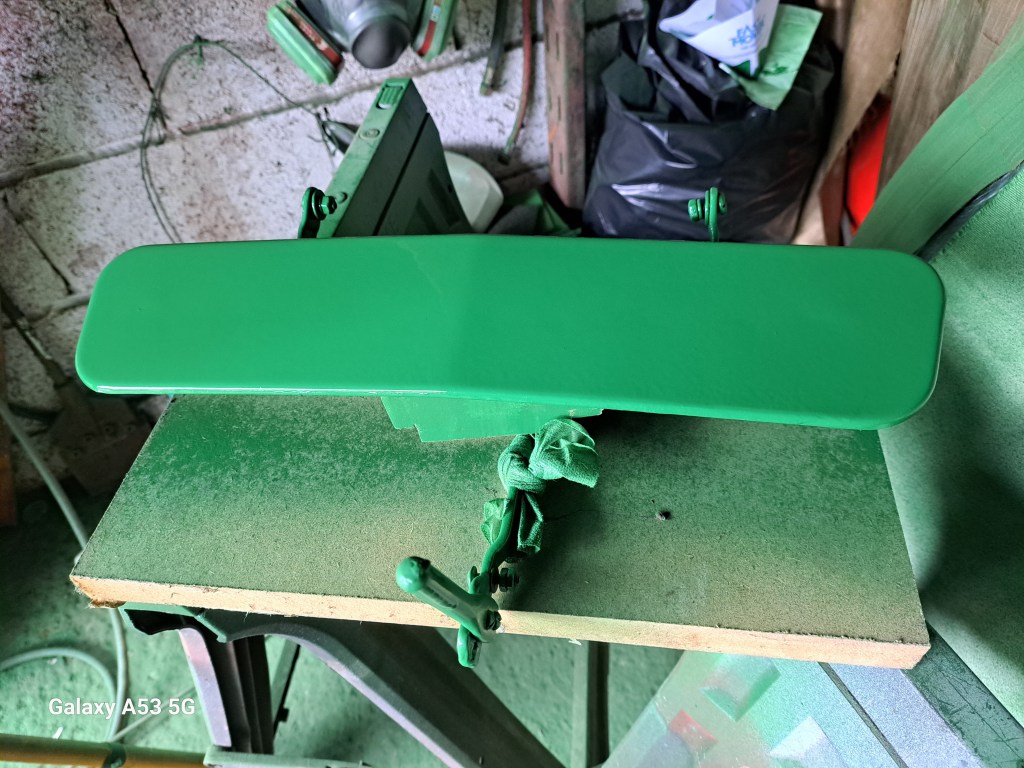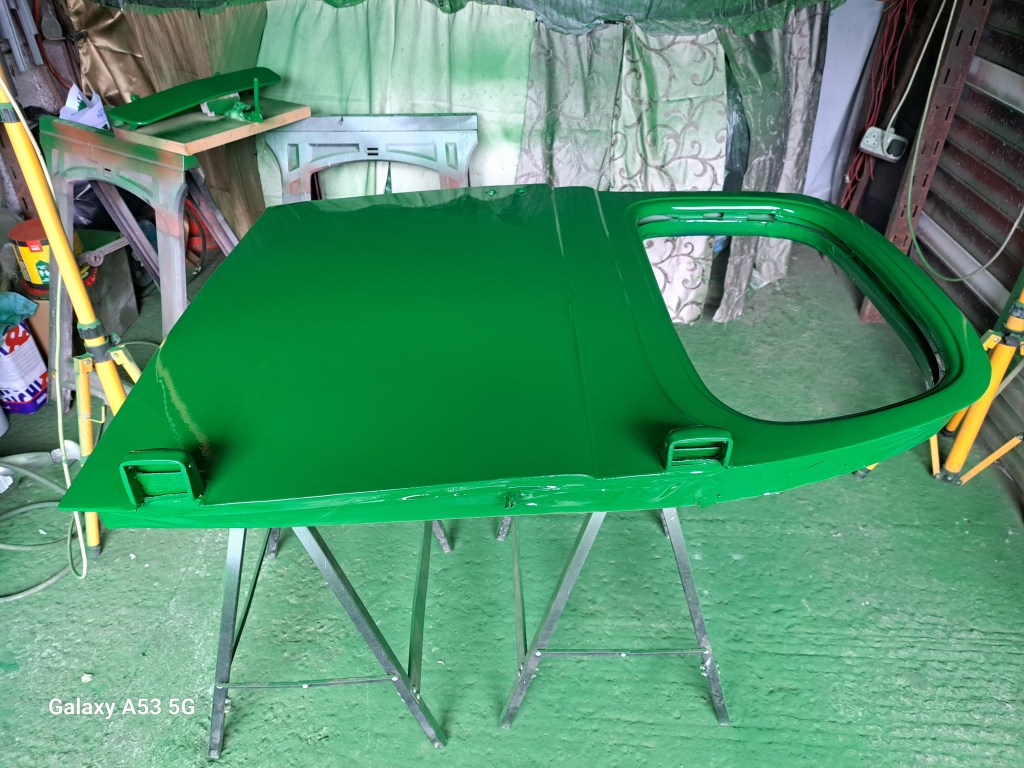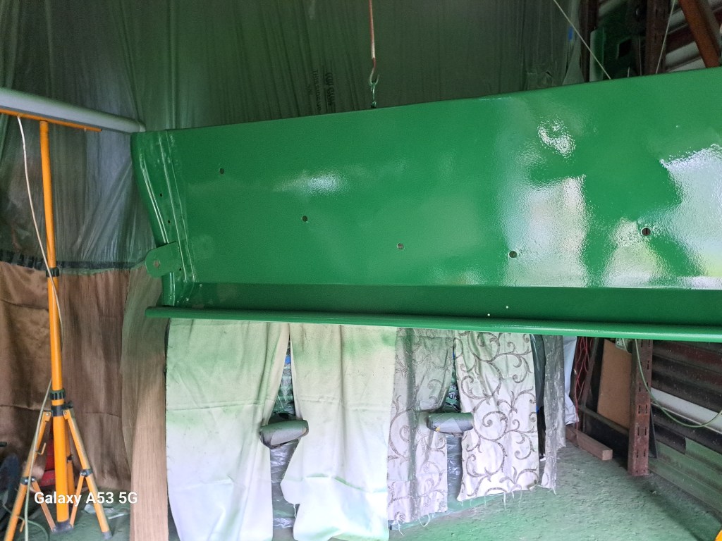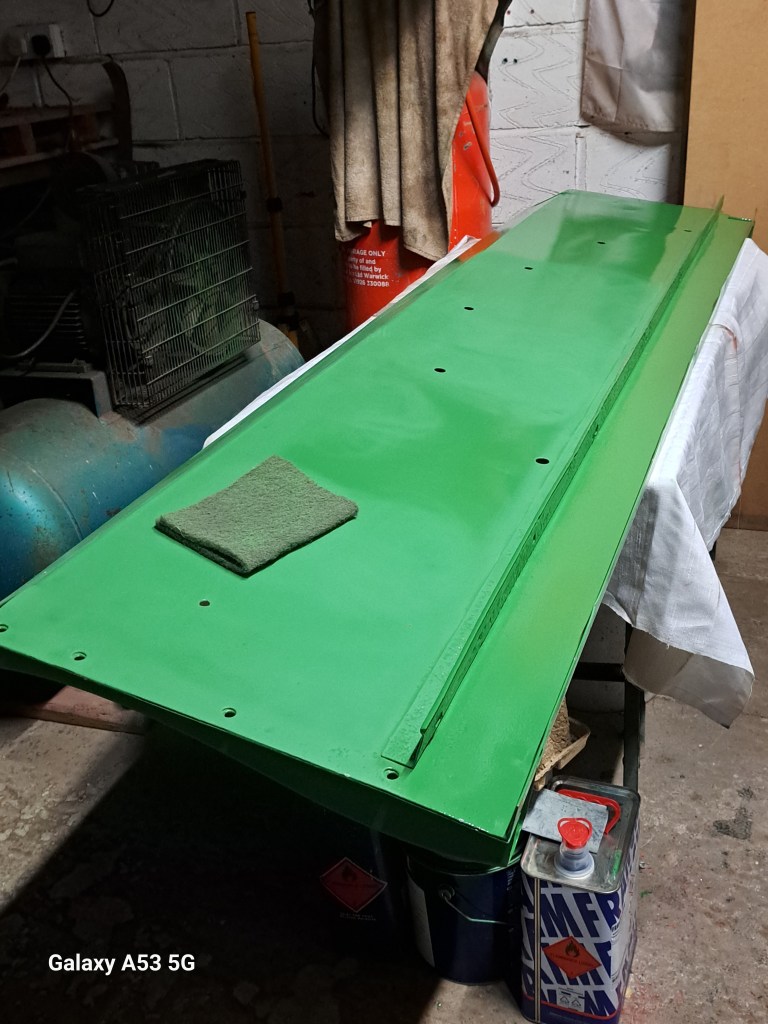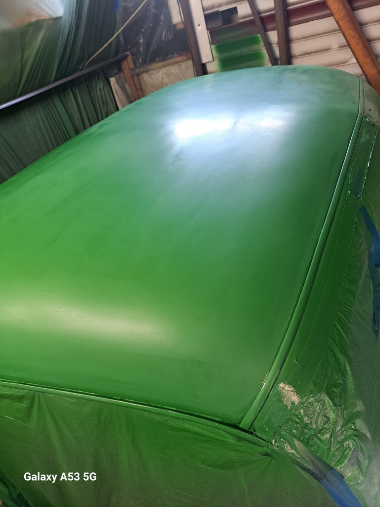 Now have the Coupe on the lift with the truck nose just in the door, curtains are up making a makeshift booth. Prep done and ready to start laying paint, problem the 5 ltrs of paint was the wrong green, apparently in 1986 John Deere change the shade from Classic to Turf/Agri Green and as I had popped the lid the supplier would not take it back. Decided to lay a couple of coats down as a base for the correct colour.