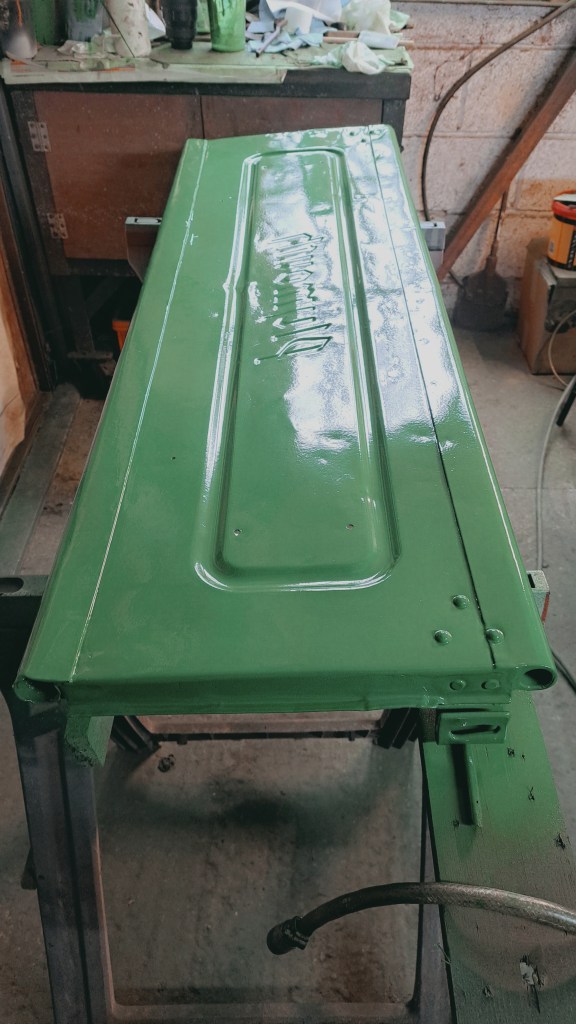 21/10/24, with the bed front and tailgate finished, I’ve moved onto the bedsides, this one has had topcoat both sides so all being well tomorrow will see the second side getting it’s first coat of finish colour. Once that is complete shall move onto the 2 doors before some small parts. Have been looking forward to working on the doors because of the John Deere logo that I have made stencils for, first I’m thinking of laying up the oval outer for the Old English White background then after a couple of days layup the more complex shapes which will be body colour.
