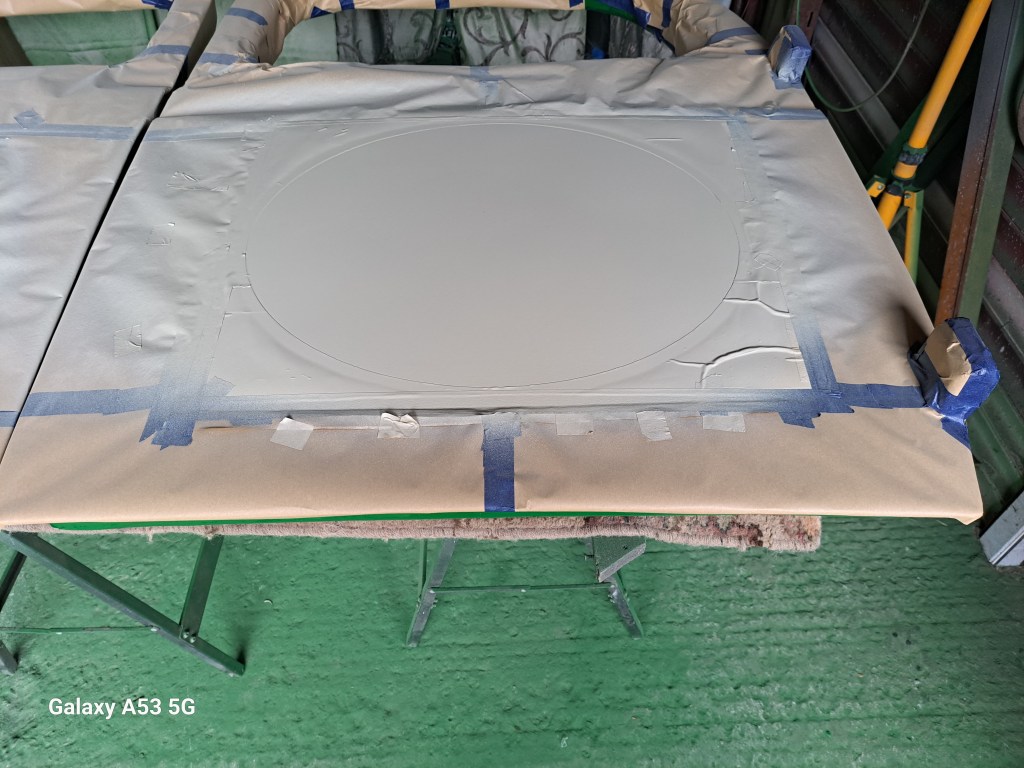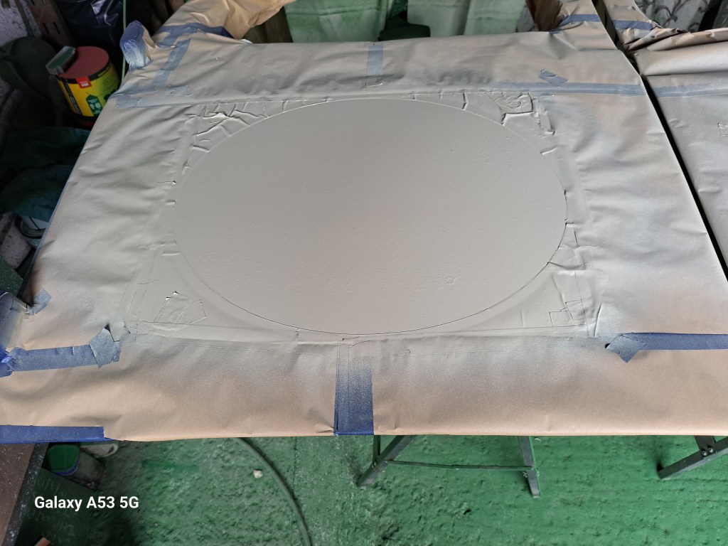 01/10/2024 First coat of Old English White, leave it for the weekend and see it requires another coat before removing the areas that need to be green on the stencils.
