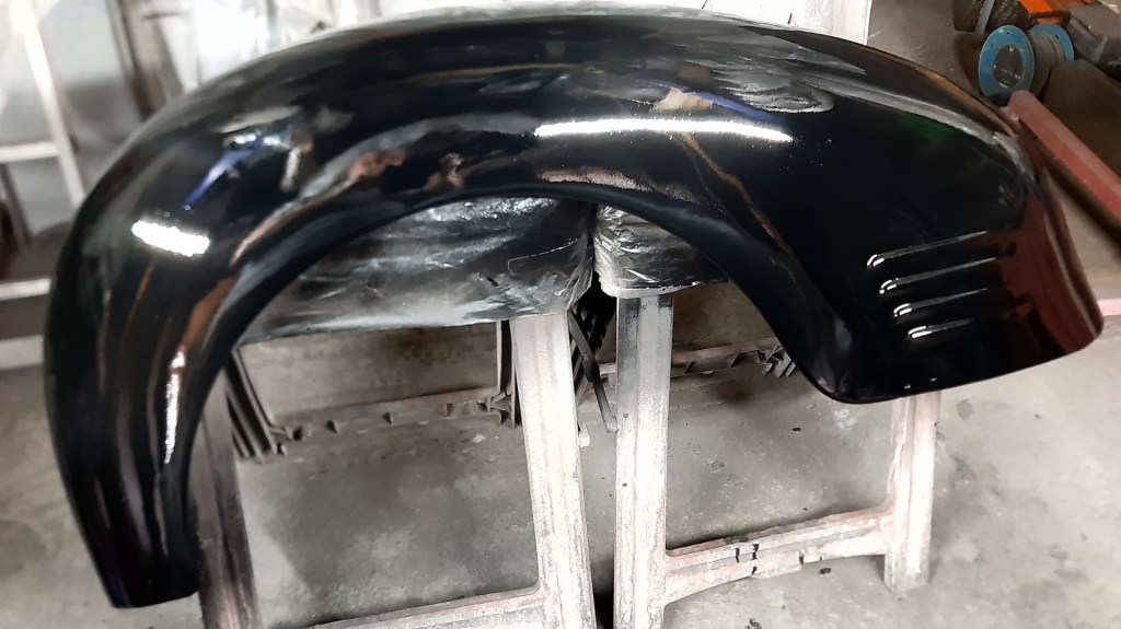 10/08/2020 First touch of black paint went on the r/h front Fender. Not the best photo but I am very pleased with the result. Second photo is the drivers side well under way 11/09/2020. Next 2 photos are the rear fenders at different stages of prep. 16/09/2020